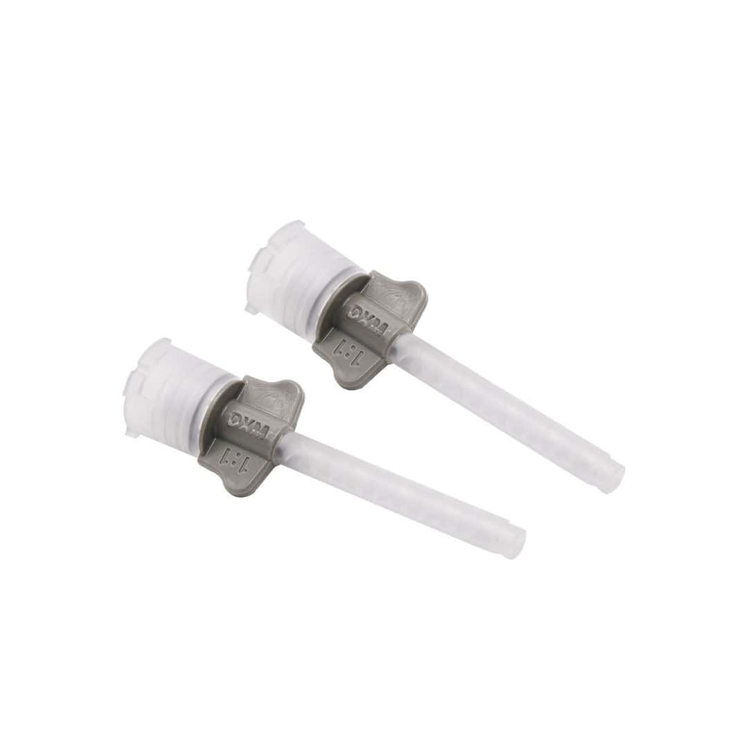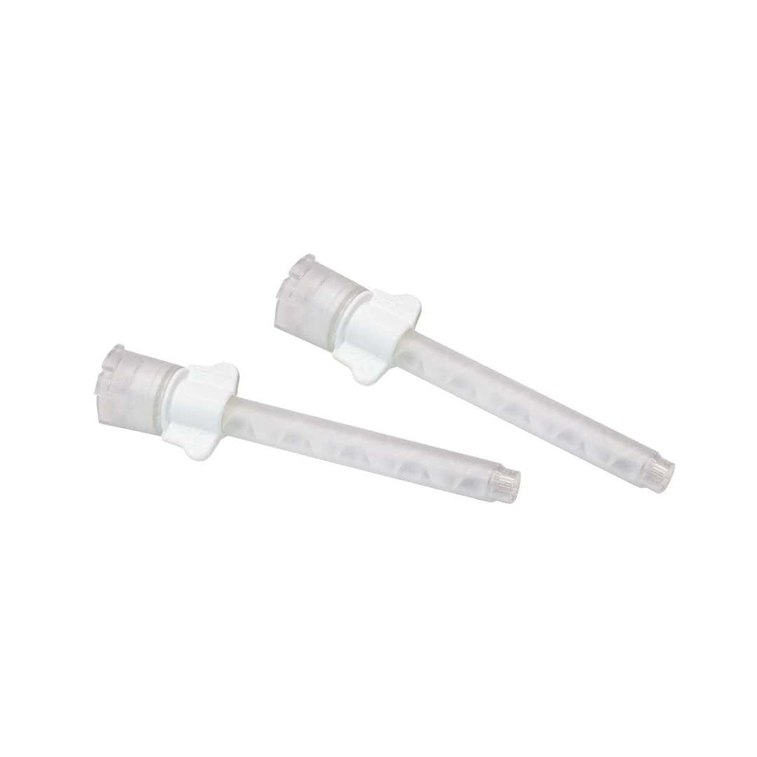 De kleur van de afsluitdop van een cartridge geeft ook de kleur aan van de diameter van de bijbehorende mengtips. Echter kan voorkomen dat een bepaalde diameter/kleur mengtip in verschillende lengtes verkrijgbaar is. Dit is nooit een keuzemogelijkheid want de lengte van de tip met daarin het geïntegreerde mengmechanisme staat garant voor een volledige vermenging van een bepaald materiaal. Ga op zeker en kies altijd voor de originele mengtips van de fabrikant. Er zijn tegenwoordig ook veel imitatie mengtips op de markt die vaak geen correcte vermenging geven waardoor er afdrukonnauwkeurigheden kunnen ontstaan.